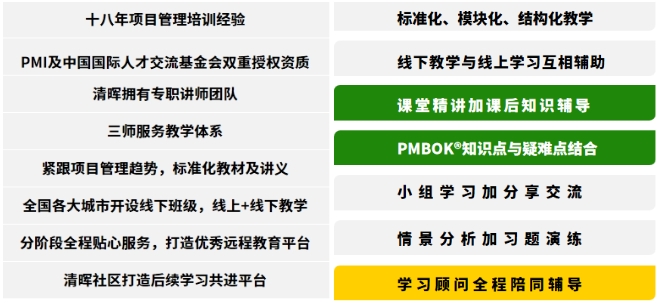 清晖PMP课程采取线上+线下相结合的模式,帮助学员深入理解《项目管理知识体系指南(PMBOK®指南)》(第6版、第7版)、项目管理五大过程组、十大知识领域及49个过程、敏捷项目管理基础、十二大原则与八大绩效域。
