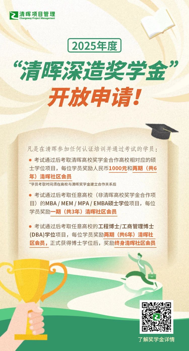 “清晖深造奖学金”为上海清晖管理咨询有限公司面向清晖学员所发布的奖学金激励计划,旨在激发清晖学员持续深造学习的积极性。本奖学金本着公开、公平、公正原则,奖励给有志于在项目管理领域持续深造发展,勇于攀登、锐意进取的优秀学员。