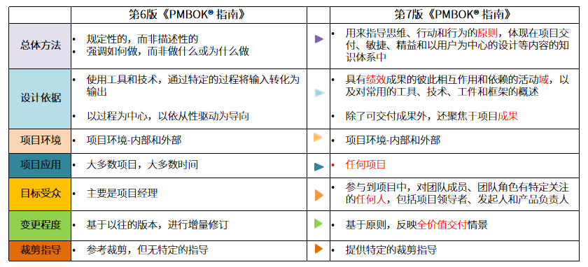 这几乎是彻底与过去40年传统做了决裂,完全进入一个全新的视角。2020年,PMI官网正式公布了《PMBOK 指南》第6版与第7版的对比,如表1所示。