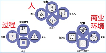 这12条原则各有侧重,彼此的覆盖面尽可能不重复交叠。考虑到12条原则简单罗列不太容易记忆,个人建议可以参考PMP考纲的三大主题领域:人、过程和商业环境,将这12原则进行亲和归类(见图2),人的主题对应了管家、团队、干系人和领导力这四条原则,其中管家相对而言最为重要。过程主题对应了系统思考、裁剪、质量和风险这四条原则,其中系统思考相对而言最为重要。商业环境主题对应了价值、复杂性、适应性和韧性,以及变革这四条原则,其中价值相对而言最为重要。