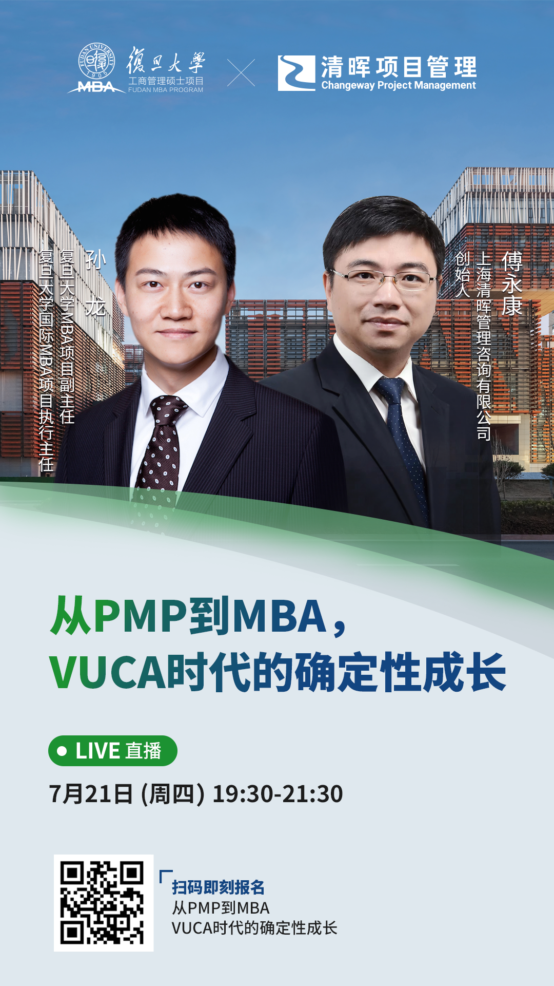 7月21日(周四)晚,我们诚邀您参与以“从PMP到MBA,VUCA时代的确定性成长!”为主题的活动,希望本次活动能够帮助大家了解从PMP到MBA全面提升管理能力的路径,为你规划职场发展,助力人生梦想,塑造理想生活,在不确定性中寻找确定性成长!