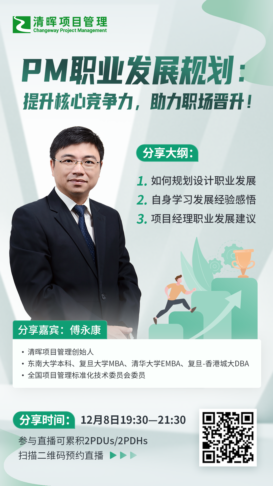 12月8日晚19:30,清晖项目管理创始人——傅永康老师,聚焦PM的职业发展规划与能力培养,助力大家突破职场困境,寻求新的机会与未来。具体详情如下: