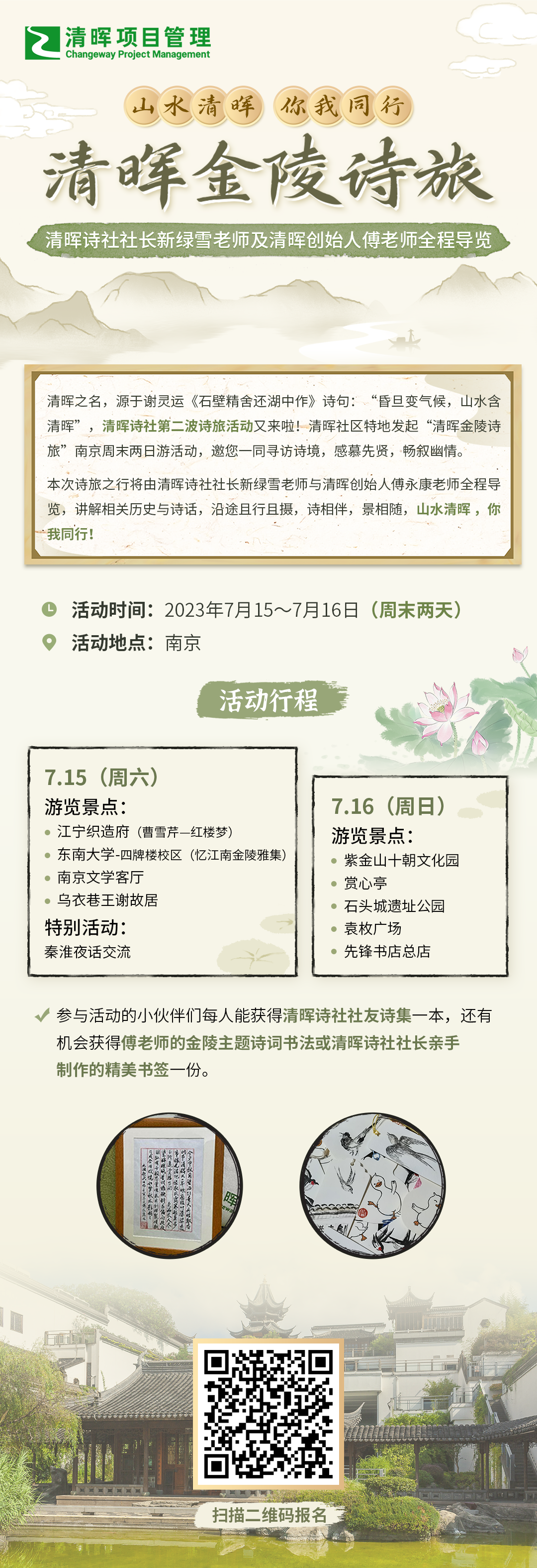 清晖之名,源于谢灵运《石壁精舍还湖中作》诗句:“昏旦变气候,山水含清晖”,清晖诗社第二波诗旅活动又来啦!清晖社区特地发起“清晖金陵诗旅”南京周末两日游活动, 邀您一同寻访诗境,畅叙幽情。