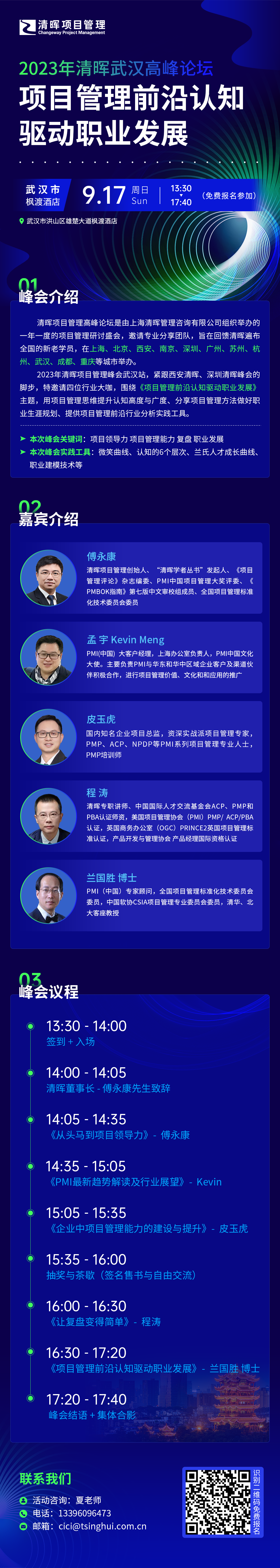 2023年清晖项目管理峰会武汉站,紧跟西安清晖、深圳清晖峰会的脚步,特邀请四位行业大咖,围绕《项目管理前沿认知驱动职业发展》主题,用项目管理思维提升认知高度与广度、分享项目管理方法做好职业生涯规划、提供项目管理前沿行业分析实践工具。