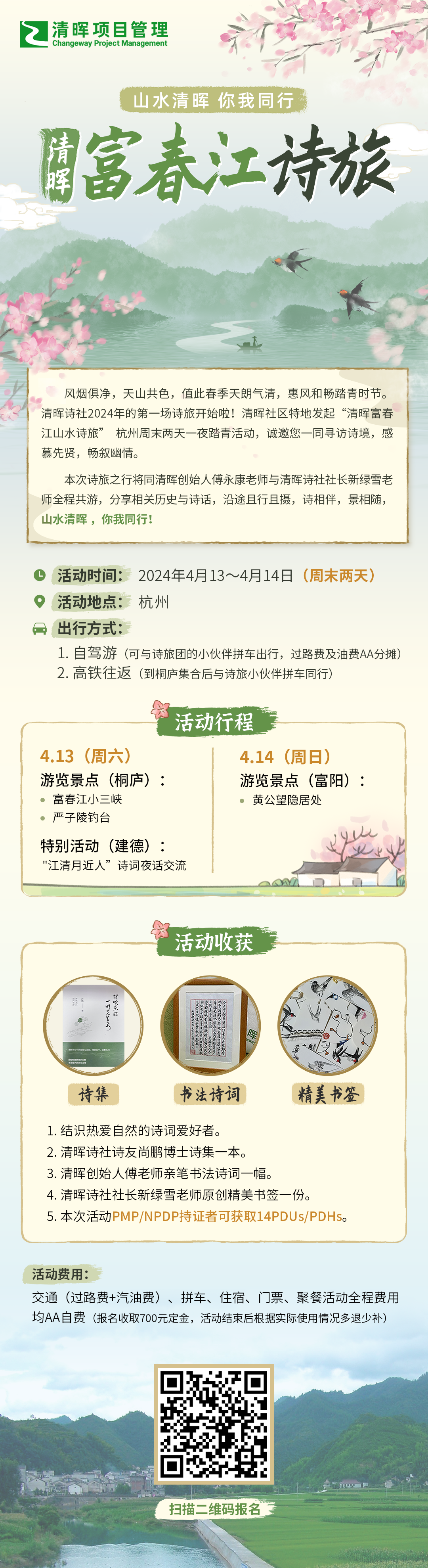 风烟俱净,天山共色,值此春季天朗气清,惠风和畅踏青时节。清晖诗社2024年的第一场诗旅开始啦!清晖社区特地发起“清晖富春江山水诗旅”杭州周末两天一夜踏青活动,诚邀您一同寻访诗境,感慕先贤,畅叙幽情。