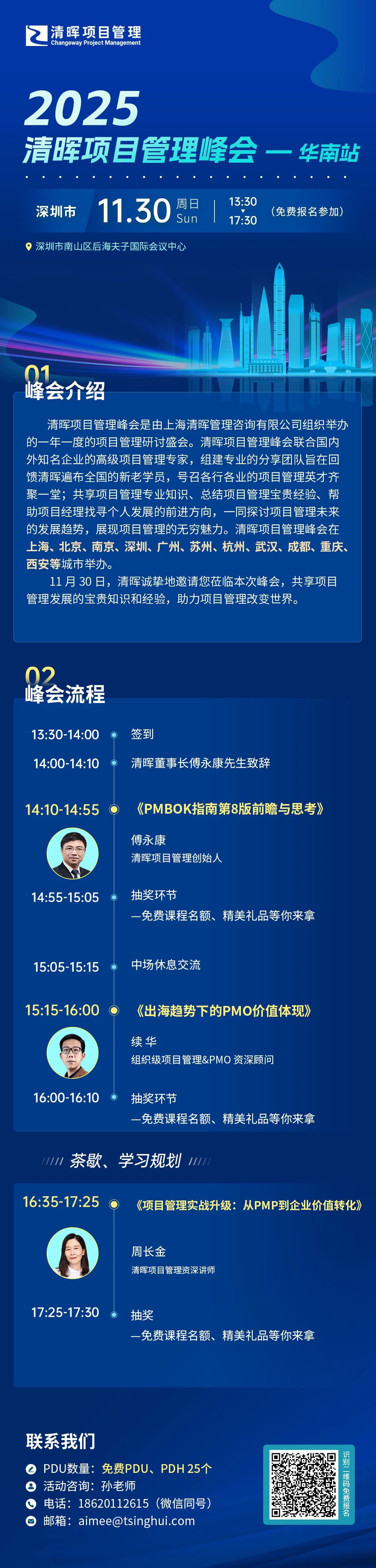 2025年11月30日,清晖诚挚地邀请您莅临本次峰会华南站,共享项目管理发展的宝贵知识和经验,助力项目管理改变世界。