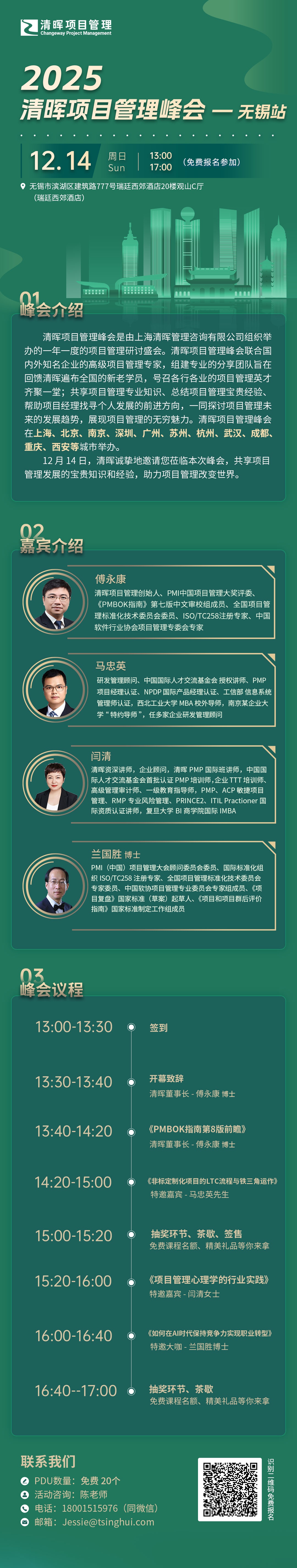 2025年12月14日,清晖诚挚地邀请您莅临本次峰会无锡站,共享项目管理发展的宝贵知识和经验,助力项目管理改变世界。