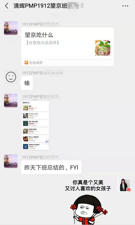 上午课间结束后,班主任带领大家拍了1912PMP望京班大合照。各个小组的组员相约一起去吃饭(前一天还有热心的同学把会场周边好吃的都列出来呢)