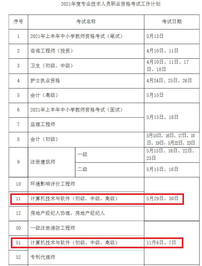 2021年度计算机技术与软件(初级、中级、高级)考试时间: