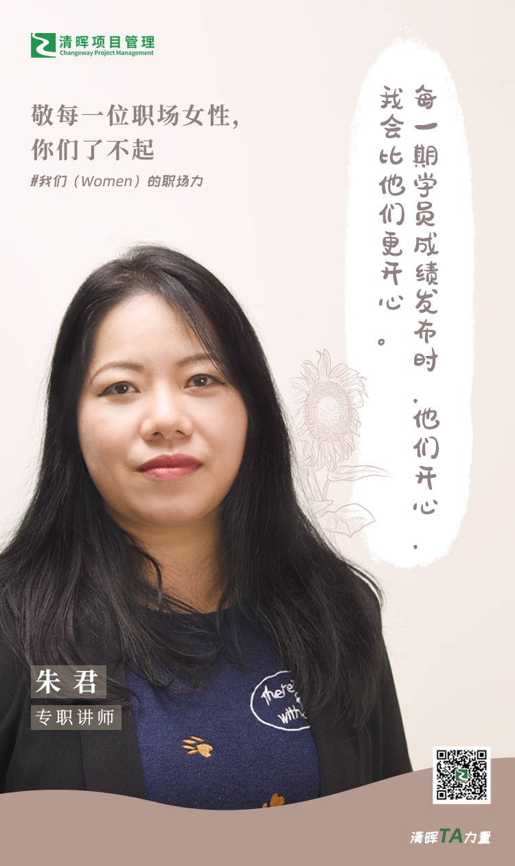 拥有十五年工作经验的朱君老师毕业之后做过高中老师、写过代码、做过测试、财务、人事,因为工作的原因接触了项目管理培训的工作,从此便走上培训讲师这条路。谈及工作中的困难,朱君老师都是一笑了之,只是觉得亏欠孩子。培训课程基本是在周末,有时候甚至还会出差,孩子要么就是拜托亲戚照顾,或者就带着他一起出差。很可惜不能在周末好好陪伴他。可说起来学员,朱君老师又觉得很开心。她说每一次学员出成绩时,考得好她会比学员更开心,这种巨大的荣誉感和自豪感,如果不是老师是很难体会到的。