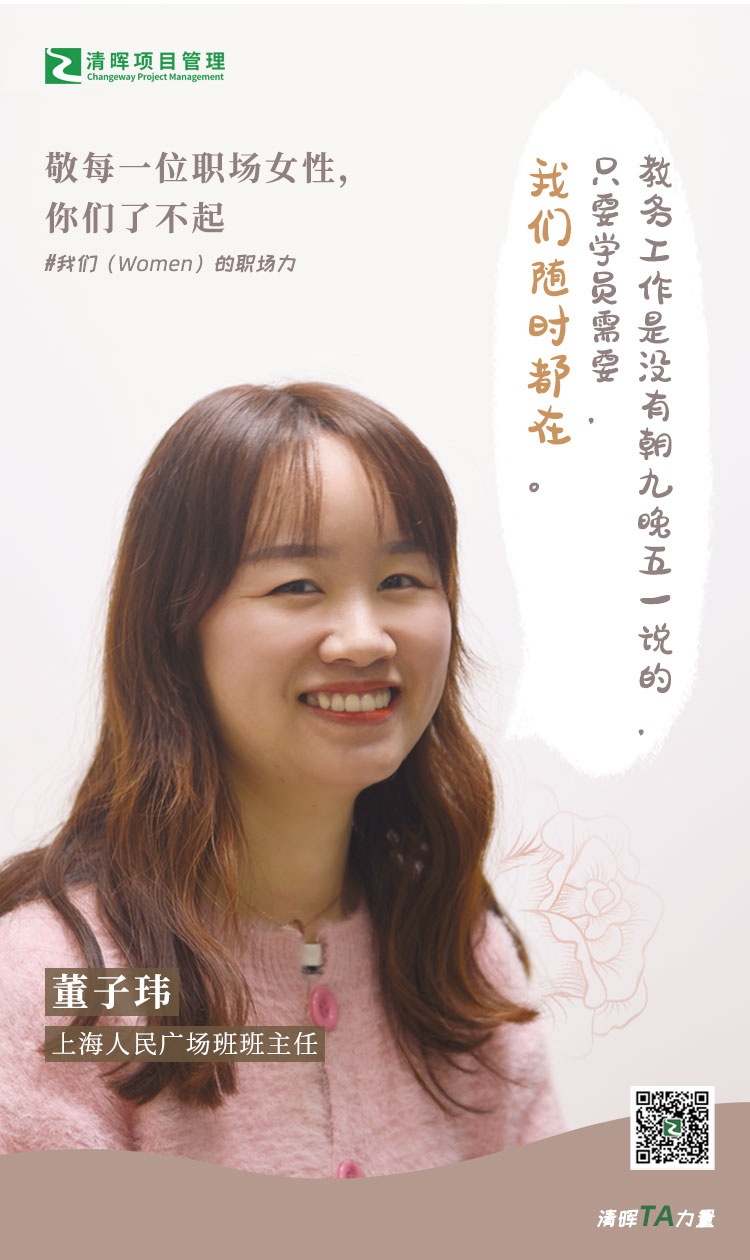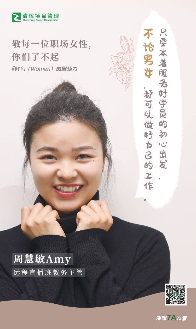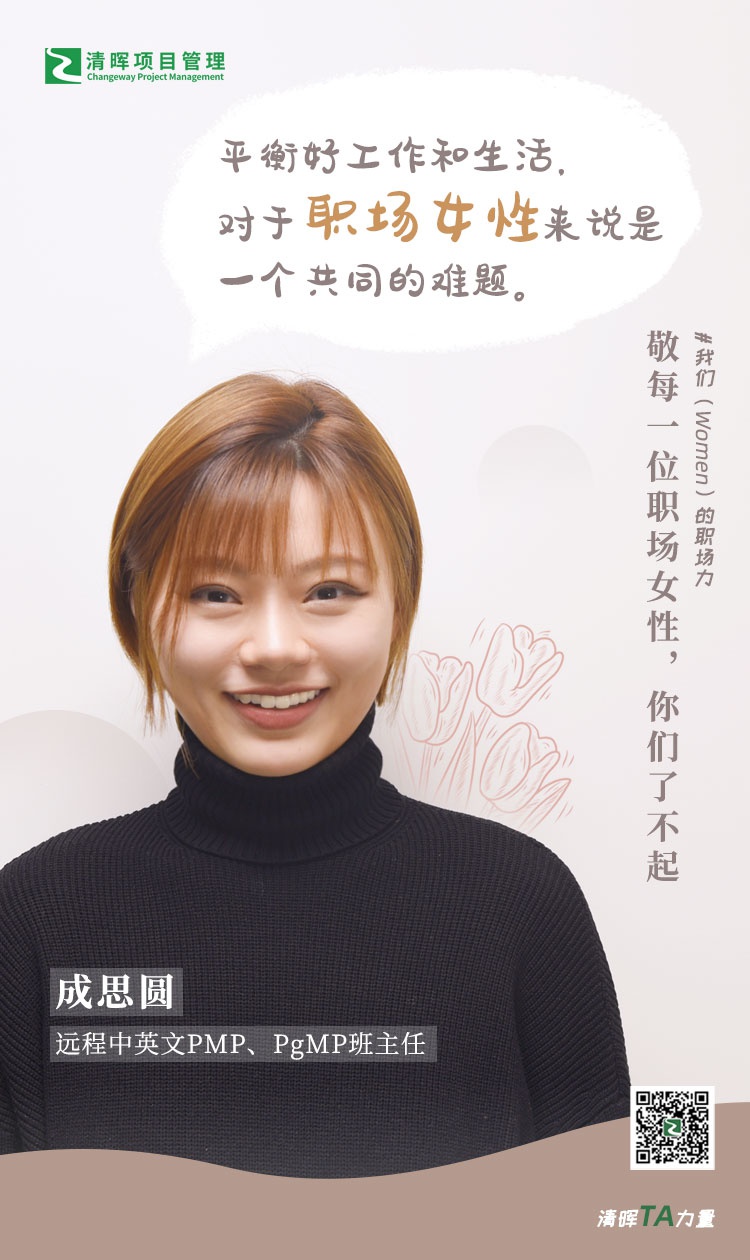 漂亮是思圆给人的第一印象,可她也没有让人忽视她的优秀。留学回国、清晖首届PMP英文班班主任、全英文考试的PgMP班主任、短时间内拿到PMP证书,这些都是她在工作中给自己的鞭策,也是对自己的严格要求。