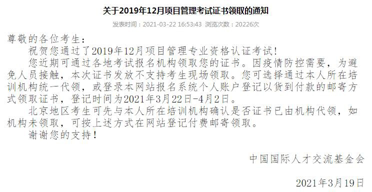 您近期可通过各地考试报名机构领取您的证书。因疫情防控需要,为避免人员接触,本次证书发放不支持考生现场领取。您可选择通过本人所在培训机构统一代领,或登录本网站报名系统个人账户登记以货到付款的邮寄方式领取证书,登记时间为2021年3月22日-4月2日。