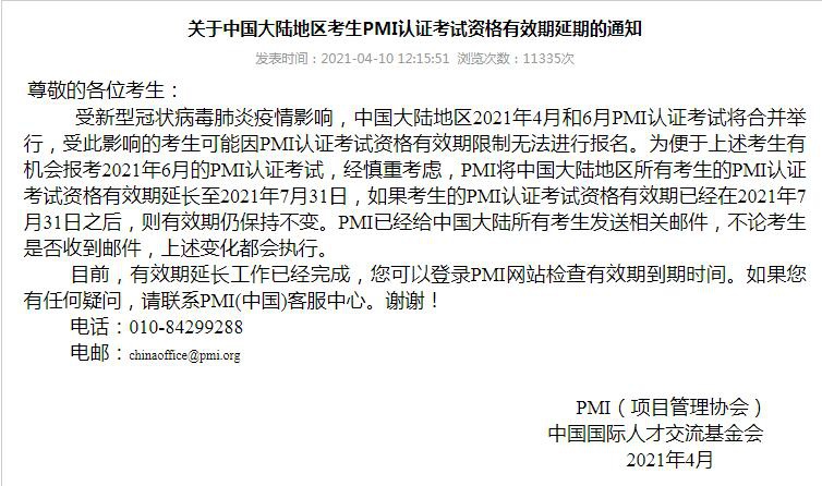 根据PMI与中国国际人才交流基金会通知,受新型冠状病毒肺炎疫情影响,中国大陆地区2021年4月和6月PMI认证考试将合并举行,受此影响的考生可能因PMI认证考试资格有效期限制无法进行报名。为便于上述考生有机会报考2021年6月的PMI认证考试,经慎重考虑,PMI将中国大陆地区所有考生的PMI认证考试资格有效期延长至2021年7月31日。以下是PMI与基金会通知原文: