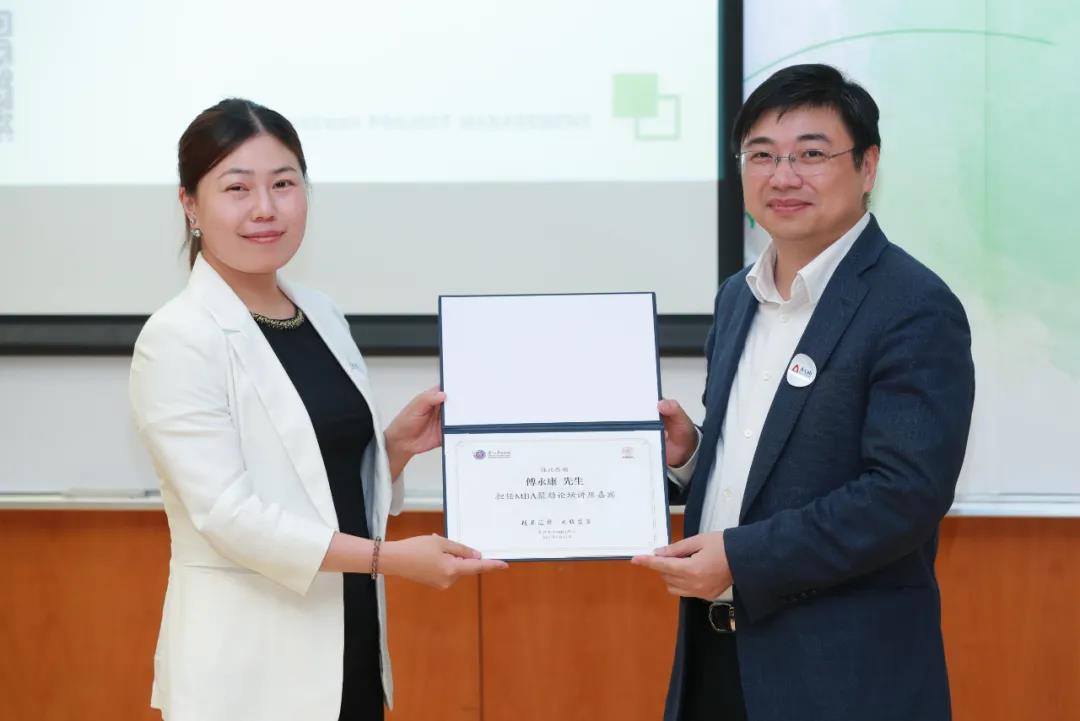 分享结束后,在场学生就创业、管理、团队等相关问题进行提问,傅永康先生结合自身经历、国外管理大师的理论一一作答,给出建议,并为提问学生赠送一本清晖译书作为纪念。随后,复旦MBA项目学生事务高级主管金钰老师为傅永康先生颁发了担任MBA聚劲论坛讲座嘉宾感谢证书并合影。