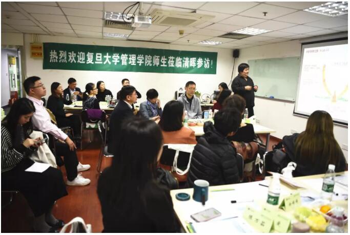 复旦MBA师生在清晖创始人傅永康老师及其团队一行带领下参观清晖,傅老师介绍了清晖的发展历程、组织架构、企业文化等基本情况,并解释清晖以绿色为标志色所象征的创新、环保意义。