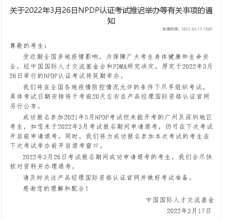 受近期全国多地疫情影响,为保障广大考生身体健康和生命安全,经中国国际人才交流基金会和PDMA研究决定,原定于2022年3月26日举行的NPDP认证考试将延期举办。