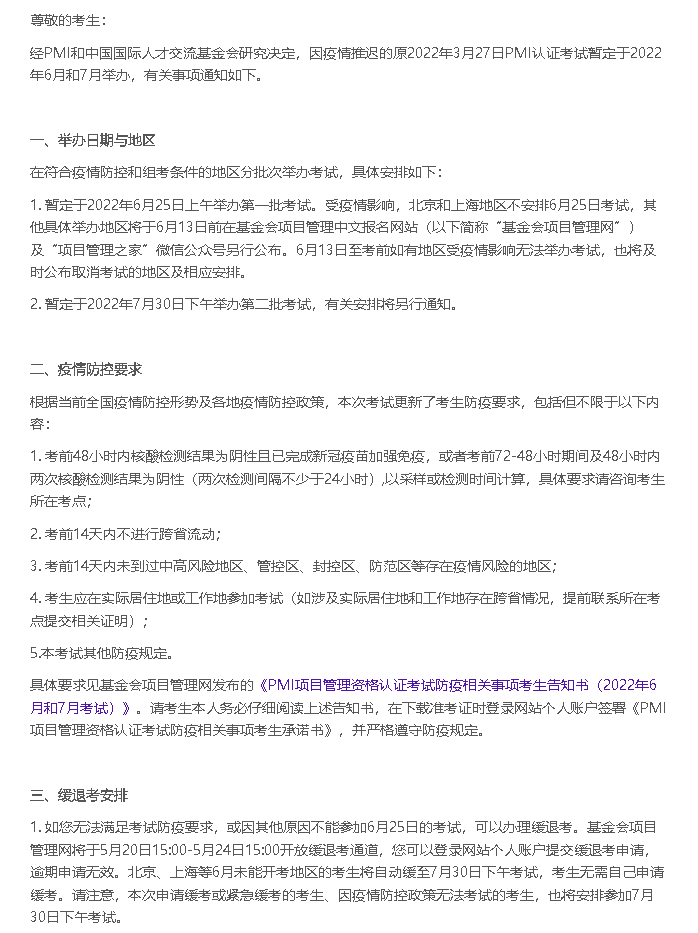 经PMI和中国国际人才交流基金会研究决定,因疫情推迟的原2022年3月27日PMI认证考试暂定于2022年6月和7月举办,有关事项通知如下。