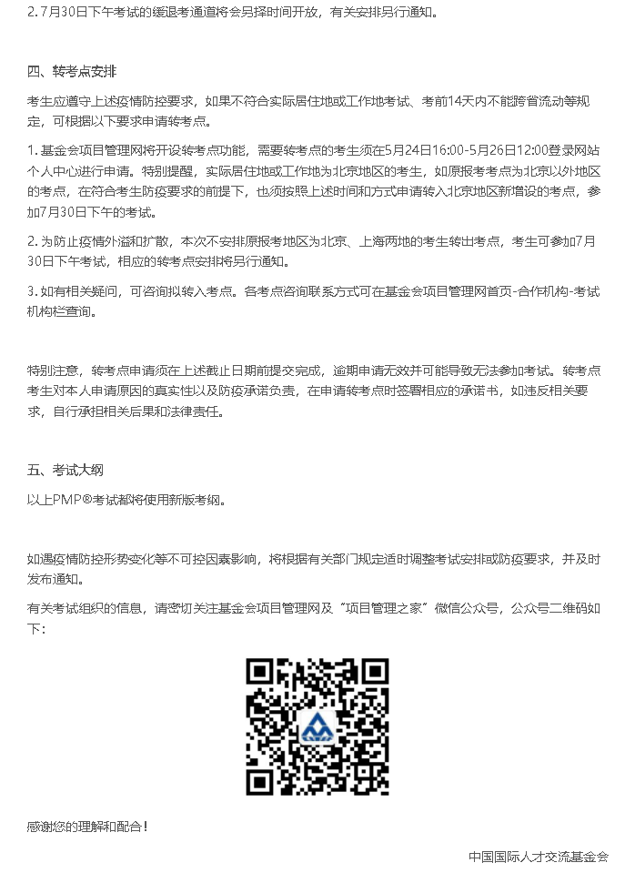 1. 基金会项目管理网将开设转考点功能,需要转考点的考生须在5月24日16:00-5月26日12:00登录网站个人中心进行申请。特别提醒,实际居住地或工作地为北京地区的考生,如原报考考点为北京以外地区的考点,在符合考生防疫要求的前提下,也须按照上述时间和方式申请转入北京地区新增设的考点,参加7月30日下午的考试。