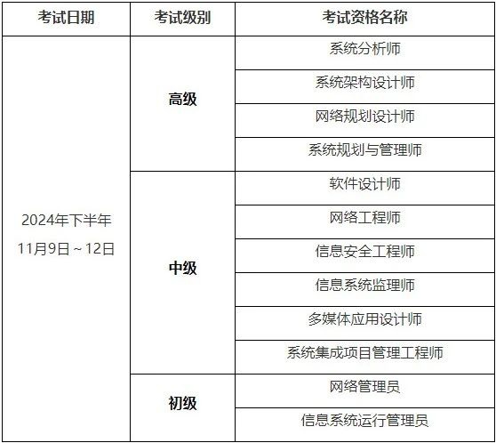 初级:程序员、信息处理技术员、网络管理员、信息系统运行管理员