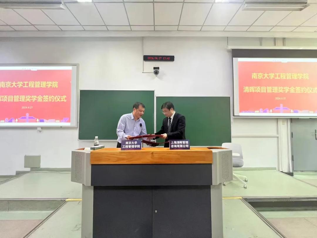 2024年4月27日,南京大学工程管理学院清晖项目管理奖学金签约仪式在南京大学鼓楼校区教学楼120举行,南京大学工程管理学院党委书记陈志云、工程管理硕士教育中心主任宁延、工程管理硕士教育中心主任助理贾俊洁、工程管理学院校友会秘书李楠,上海清晖管理咨询有限公司创始人傅永康、清晖市场总监饶琳、清晖南京分公司总经理蔡兰、清晖南京分公司奖学金合作专员刘念以及南京大学MEM学生参加仪式。本次活动由南京大学工程管理硕士教育中心主任宁延主持。