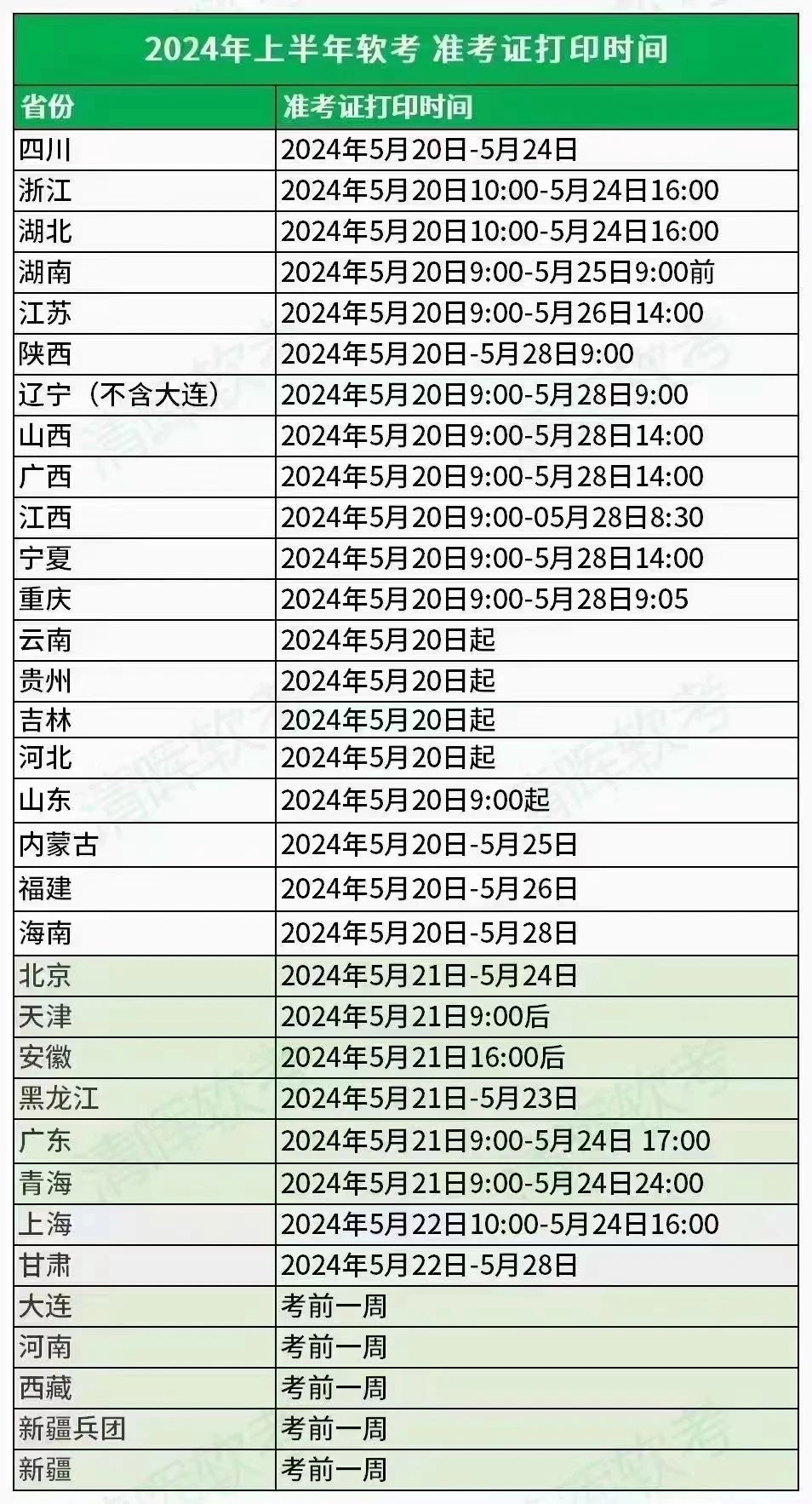 温馨提示:下表中有部分地区截止时间是5月28日,请大家不必在意是否写错了,这是因为以下准考证打印时间主要来源于各地报名通知,原计划考试时间为5月25-28日,所以在当时有些地区规定的打印时间是28日结束。