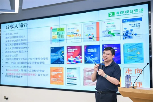 随后,傅永康董事长为大家带来了精彩的“项目管理前沿“专题讲座《从PMBOK7到HBR项目管理手册》。他详细介绍了PMBOK7的修订过程、项目管理的最新框架和理念,深入阐述了项目管理在社会不同领域的实际应用和前景,为师生们提供了一场学术盛宴。