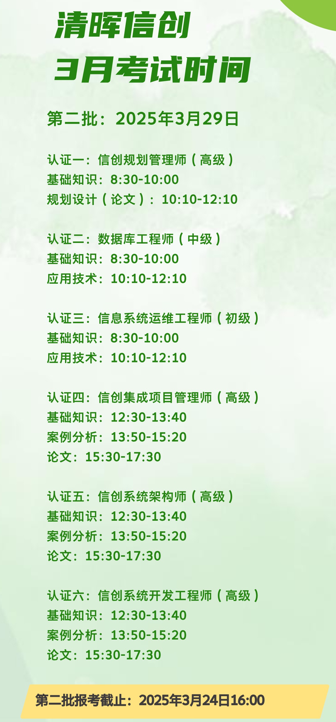 2025年3月信创认证考试报名现在已开始,截止时间为2025年3月24日16:00,考试时间在2025年3月29日,需要参加信创认证考试的同学需要抓紧时间啦!