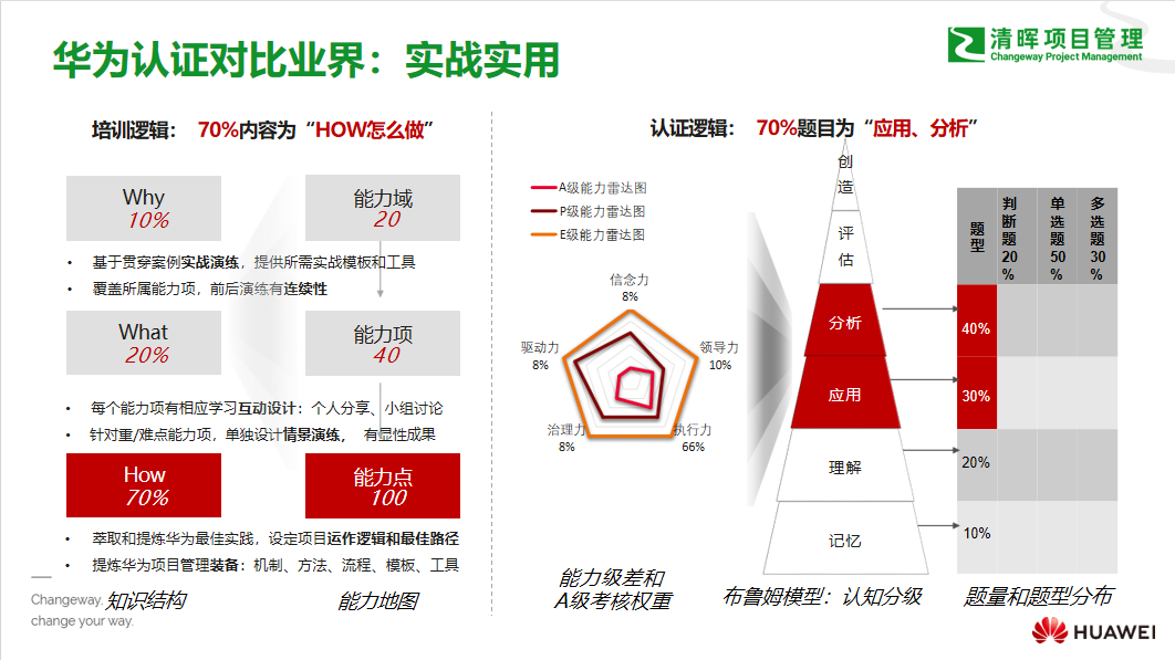 分析 (40%): 这不是纸上谈兵!华为认证要求你像一位真正的项目经理那样,拆解复杂项目场景、识别核心风险、评估关键路径、进行科学决策。占比最高,意味着这是认证的核心目标——培养你解决实际问题的脑力与眼力。
