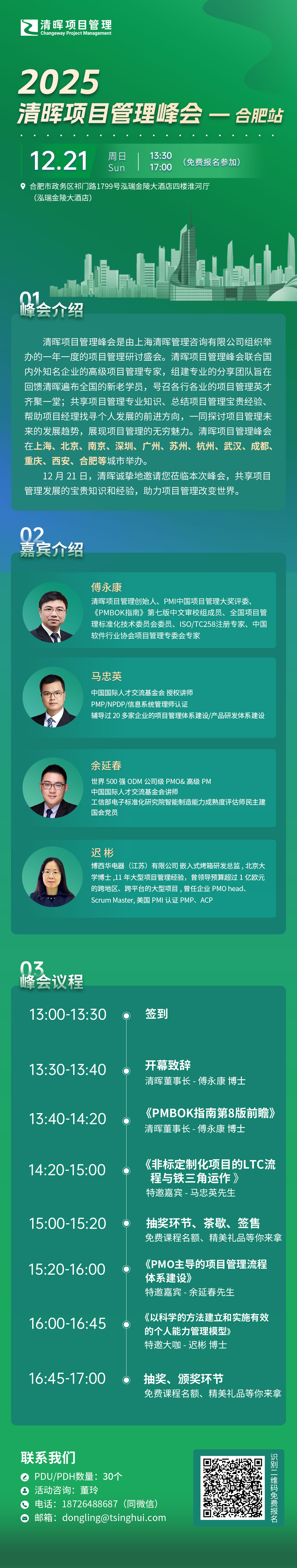 清晖项目管理峰会是由上海清晖管理咨询有限公司组织举办的一年一度的项目管理研讨盛会。清晖项目管理峰会联合国内外知名企业的高级项目管理专家,组建专业的分享团队旨在回馈清晖遍布全国的新老学员,号召各行各业的项目管理英才齐聚一堂;共享项目管理专业知识、总结项目管理宝贵经验、帮助项目经理找寻个人发展的前进方向,一同探讨项目管理未来的发展趋势,展现项目管理的无穷魅力。清晖项目管理峰会在上海、北京、南京、深圳、广州、苏州、杭州、武汉、成都、重庆、西安、合肥等城市举办。