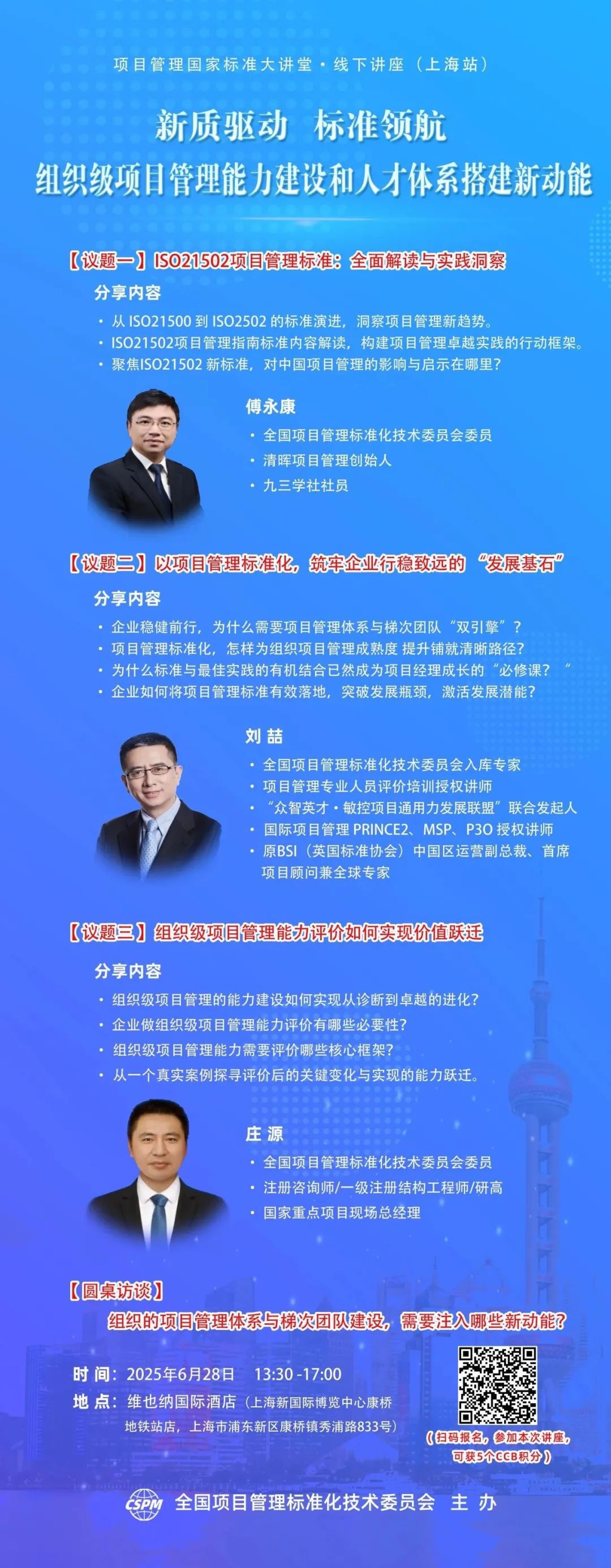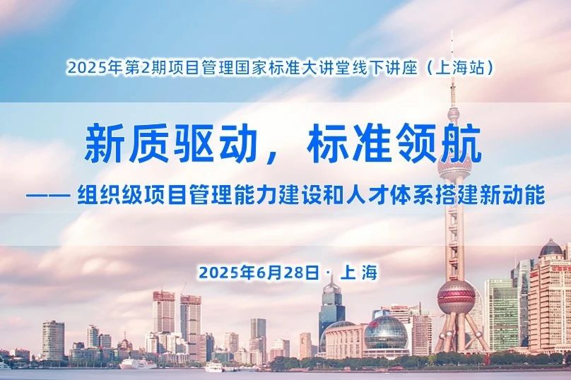由全国项目管理标准化技术委员会主办的2025年第2期项目管理国家标准大讲堂线下讲座,即将于6月28日在上海举办。