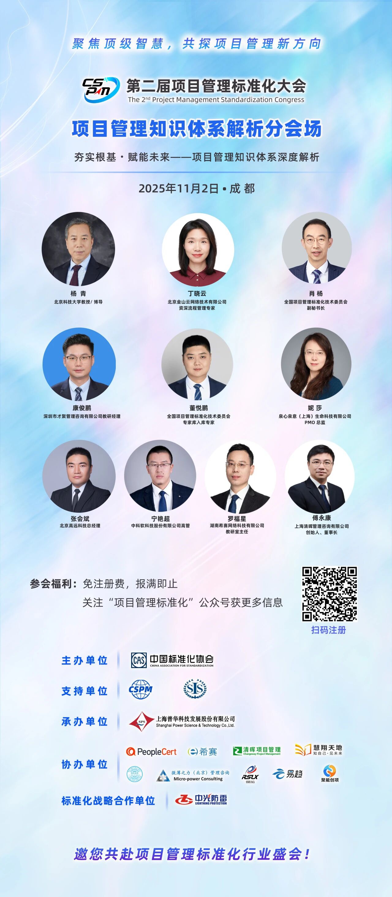 本次大会将围绕主题,汇聚全球项目管理顶级专家、学者和卓越实践者,共同探讨新时代背景下,如何以标准化引领,深化项目管理理论创新与实践应用体系构建,加速推进数字化转型与人工智能技术在项目管理领域的场景落地,彰显项目管理与前沿科技的深度融合范式,强化其在驱动产业升级、促进区域协调发展中的战略支点作用。通过构建项目管理与标准化建设的协同创新机制,使其成为全面深化改革的重要抓手,为中国式现代化建设注入新动能。