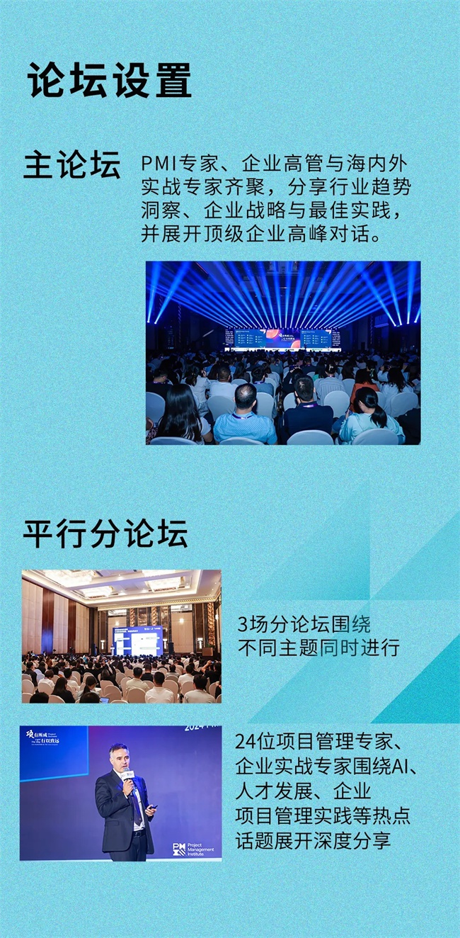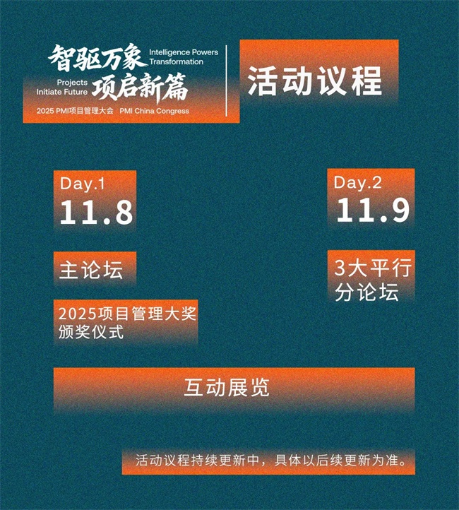 会议分享板块包括11月8日下午的主论坛和11月9日全天的三个平行主题分论坛,将从行业趋势、议题研讨、跨界交流与资源对接等多维度出发,设立丰富活动板块,全力打造中国项目管理领域最具影响力的共创共享平台,推动每一个人、每一个组织在协作中突破边界、开启新篇。