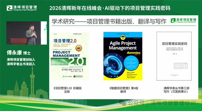 在学术研究领域,傅永康博士深度参与了ISO 21520人工智能项目管理标准,与陈万茹老师共同参与了中国项目管理知识体系的制定,并负责了《项目管理2.0》珍藏版的出版和《敏捷项目管理》第4版的翻译,同时清晖学者从书第三版《项目管理实践密码》在作者兰国胜博士的努力下顺利完成了全书的写作工作。