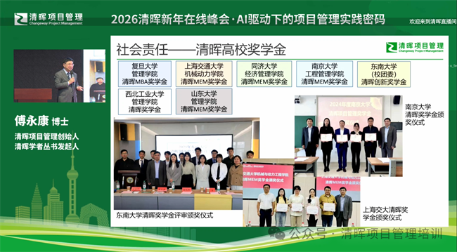 在社会责任层面,傅博士的分享充满了温度与格局。一方面,清晖奖学金计划已覆盖南京大学、复旦大学、上海交大、同济大学、山东大学等七所顶尖高校,鼎力支持国家培育未来的项目管理英才。