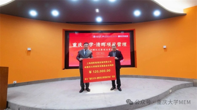 此次奖学金捐赠,由上海清晖管理咨询有限公司向重庆大学教育发展基金会捐资设立,专项用于支持重庆大学非全日制MEM在读学生的学习与创新,奖励在学业上取得优越成绩的学生个人和团队。