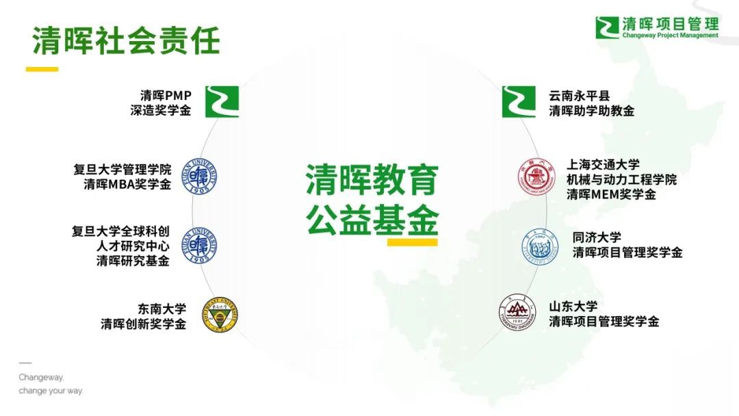 身处教育培训行业,清晖对于培养职业精英人才的目光是开放的,也早已深刻意识到作为一家企业,肩上应该承担的社会责任是巨大的,清晖将这二者融合在了一起。为了促进项目管理在高等院校的普及发展,同时助力清晖学员追求更高的人生目标,2019年至今,清晖与各大高校陆续开展奖学金合作,已设立同济大学清晖项目管理奖学金、复旦大学管理学院清晖项目管理奖学金、上海交大机动学院-清晖MEM奖学金、山东大学清晖项目管理奖学金、东南大学“清晖创新奖学金”五大高校奖学金以及针对清晖学员的“清晖深造奖学金”, 并在云南省永平县,捐赠并设立了“清晖助学助教基金”。各类奖学金的设立是清晖对企业社会责任的履行,更是对培养具有国际视野的行业精英的真切付出。
