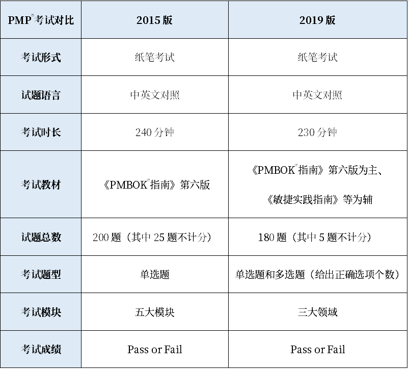 结合PMP新版考纲的内容和海外参与新考纲考试的PMP学员的考后反馈,归纳总结出如下一张针对新、老版考纲的PMP考试方式对比表以供大家了解: