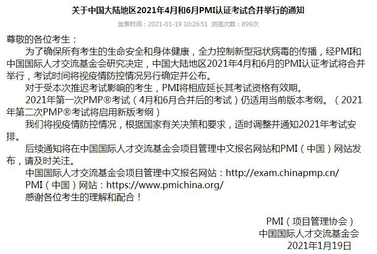 为了确保所有考生的生命安全和身体健康,全力控制新型冠状病毒的传播,经PMI和中国国际人才交流基金会研究决定,中国大陆地区2021年4月和6月的PMI认证考试将合并举行,考试时间将视疫情防控情况另行确定并公布。对于受本次推迟考试影响的考生,PMI将相应延长其考试资格有效期。2021年第一次PMP®考试(4月和6月合并后的考试)仍适用当前版本考纲。(2021年第二次PMP®考试将启用新版考纲)我们将视疫情防控情况,根据国家有关决策和要求,适时调整并通知2021年考试安排。后续通知将在中国国际人才交流基金会项目管理中文报名网站和PMI(中国)网站发布,请及时关注。中国国际人才交流基金会项目管理中文报名网站:http://exam.chinapmp.cn/PMI(中国)网站:https://www.pmichina.org/感谢各位考生的理解和配合!